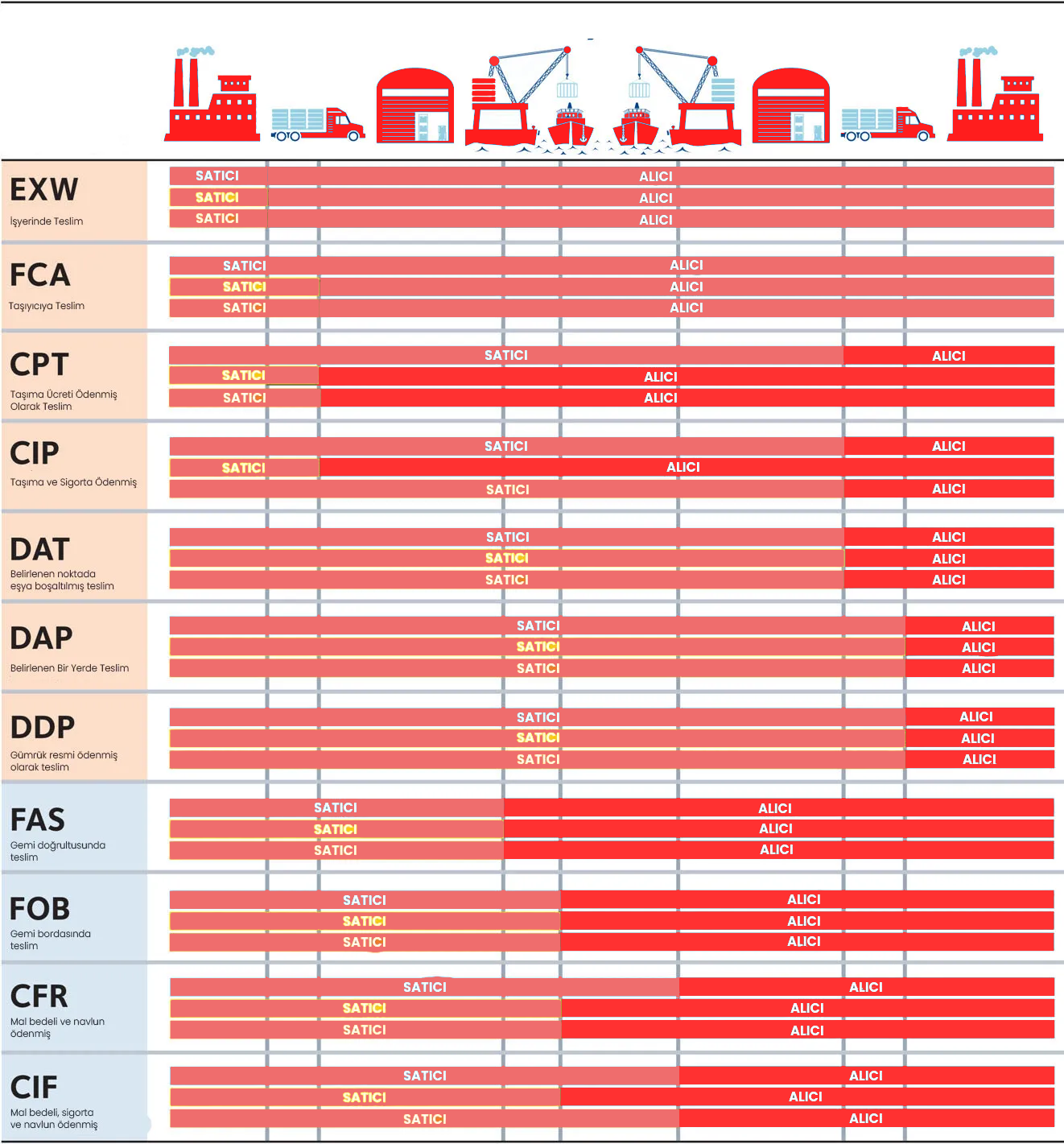 Satıcı, malları gemide teslim eder veya teslim edilmiş malları temin eder. Malların kaybolma veya hasar görme riski, ürünler gemideyken geçer. Satıcı, malları belirtilen varış limanına getirmek için gerekli masrafları ve navlun için sözleşme yapmalı ve bunları ödemelidir. Satıcı ayrıca, alıcının taşıma sırasında malların kaybolması veya hasar görmesi riskine karşı sigorta teminatı için sözleşme yapar. Alıcı, CIF kapsamında satıcının yalnızca asgari teminat kapsamında sigorta yaptırması gerektiğini unutmamalıdır. Alıcının daha fazla sigorta korumasına sahip olmak istemesi halinde, ya satıcıyla bu kadar açık bir şekilde anlaşmaya varması ya da kendi ekstra sigorta düzenlemelerini yapması gerekecektir.